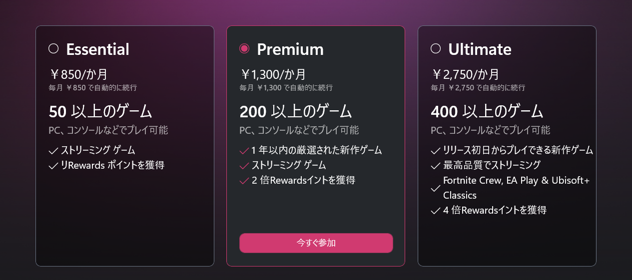 しれっと値上がってたり、なんか仕組みが変わってたりする。プランごとにできるゲームが分かれていて、たぶん大体のゲームがpremiumプランでできる。一部のゲームがUltimateに加入しないとできないように見えた。まあそれでもフルプライスのゲームができたりするって考えると余裕で安いんですが。