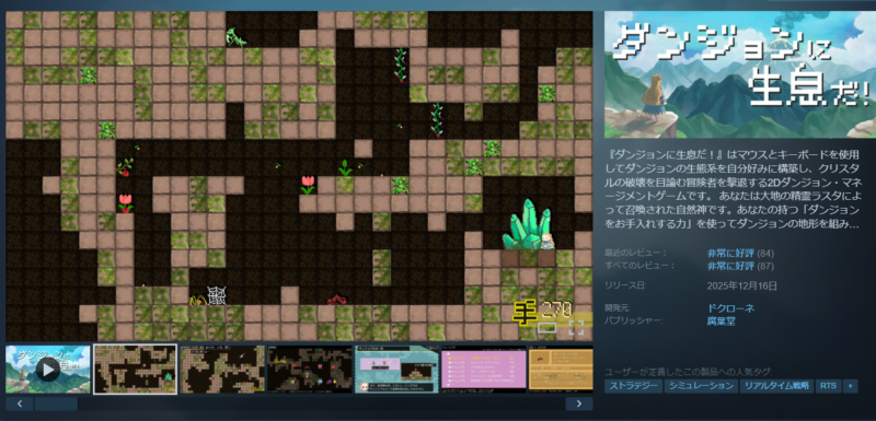 ここまで同じ同じと言ったんですが、画像を見ての通りゲームシステムは刷新されています。元々のダンジョンを掘るという仕組みではなく、ダンジョンはすでに構築されていて苔をつついて生物を作っていく流れになります。重力方向も画面から奥ではなく上から下方向に変わっています。