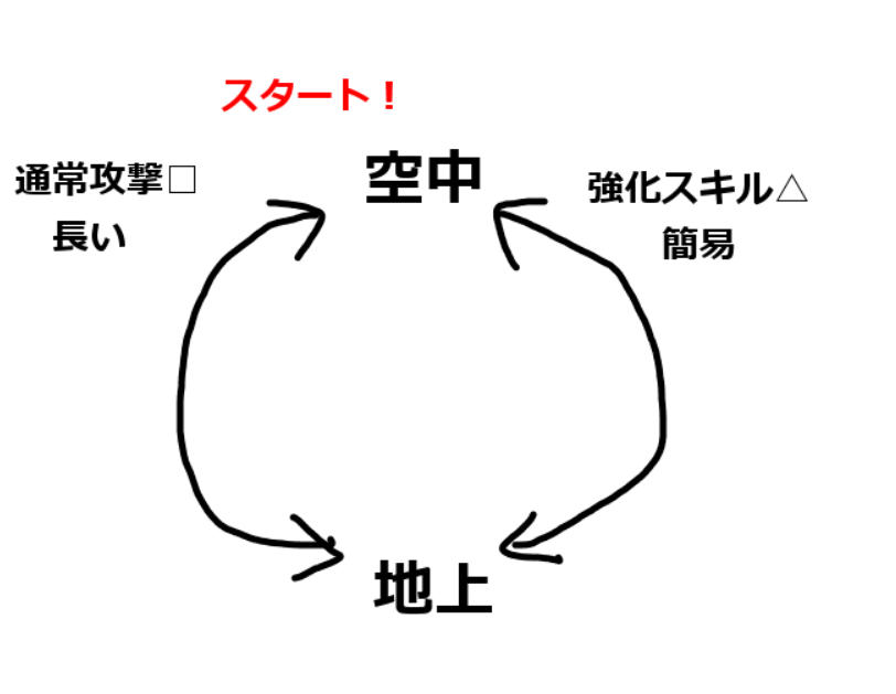 わかりやすそうでわかりにくいけどこんなイメージ。通常攻撃をするとモーションは増えて殴れる時間は増える。ただ倍率がそこまで高くないので、段数飛ばせる強化スキル打って簡略化しようってイメージ。