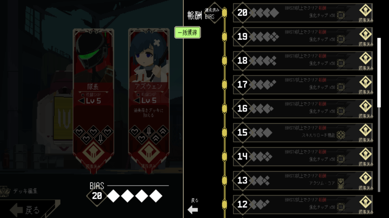 実績とか埋めてたぶん全部やりきった。ボスはそれぞれスキップできるので、ボスによって対策デッキを組む、というのがこのゲームの1つのコンセプトに見えるんだけど、全レベル報酬があってそんなの面倒なので、結局最後まで全部のボスに対応できるデッキを目指した。