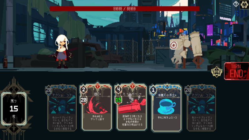 2つめは、コストを使う数=デッキドローであること。普段コストやリソースがかかるドローが、コストを使えばおまけで引けてしまうなんて最強じゃんって思うかもしれませんが、このゲームは1ターンで敵を倒す必要があるため、デッキの20枚から初手5枚を引いた15枚のデッキを引き切ると負けます。なのでドローで無限に戦えそうに見えて、実際のところ15コストで運用しないといけないゲームなんですよね。じゃあある程度コストを絞って運用しないといけないのかと思うんですが、コスト0だとドローができないのでバランスが難しいところ。