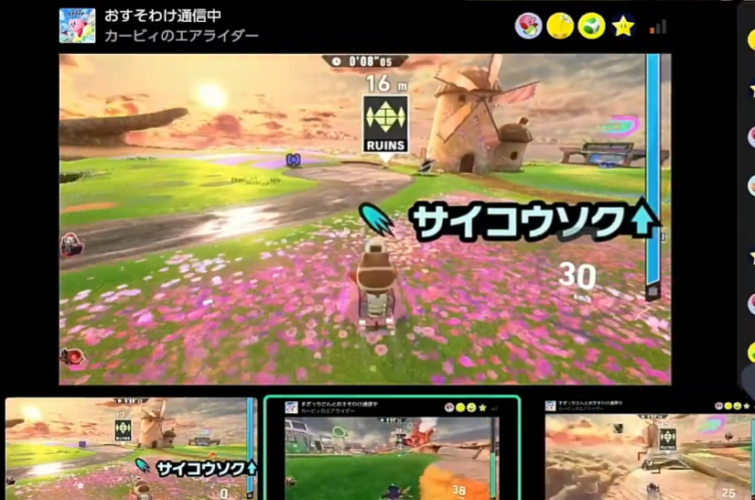 このおすそ分け通信というものは、ソフトがある本体のSwitch2から映像を送るって仕組みらしい。このおかげで動かすデータのダウンロードなどせずに気軽に遊べるとか。私は受け取る側でプレイしてないのでわからないですが、これくらい画面が忙しいエアライダーでラグがあって遊びにくいって話は出ていないので、そこは問題なく遊べるようです。普通にこれはすごいことだと思います。ただ、やってる間に、画質は悪いかもって言われてたので、そこは気になるかもしれない点かも。3つも良い画質で送るのは大変そうだからしかたないか。