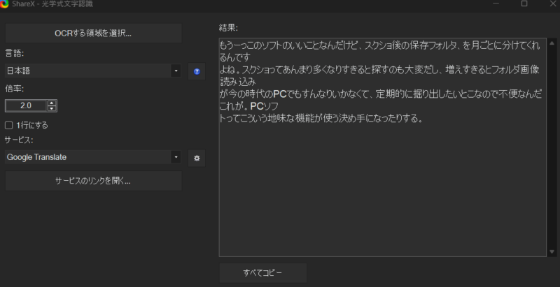 あと、このソフトを眺めてもう一つ見つけて使ってるのがOCR機能。OCRというのはPCの画面上の文字を読み取るという機能で。