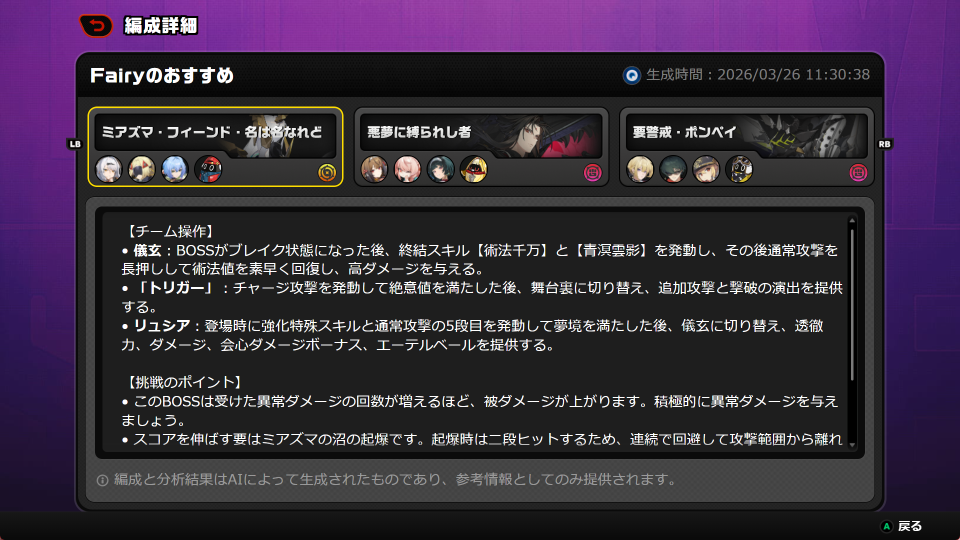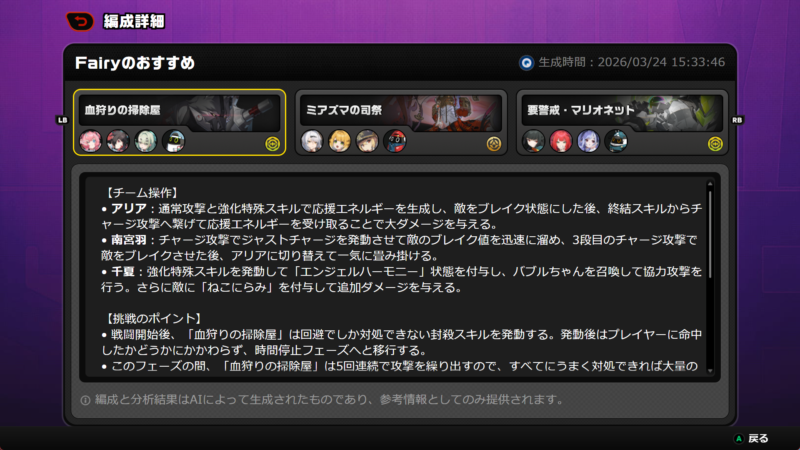 ゼンレスゾーンゼロのゲームでパーティ編成の振り分けが必要なコンテンツがあるんですが、それをAIが自動で考えてくれる機能が追加された。