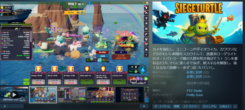 rusty’sって放置ゲーがなかなか面白くてしばらくやっていたんですが、全コースクリアして実績も埋めたのでなにか別のやつをやってみようってことでSiegeturtleっていうカメが戦うゲームをはじめた。